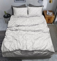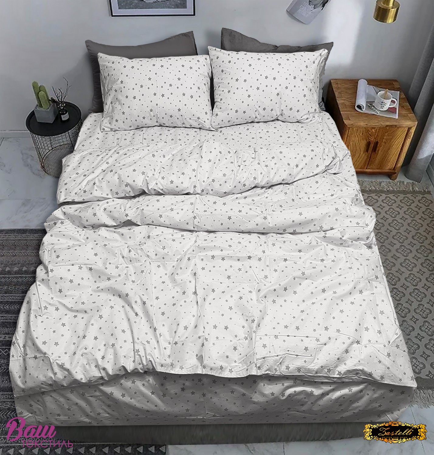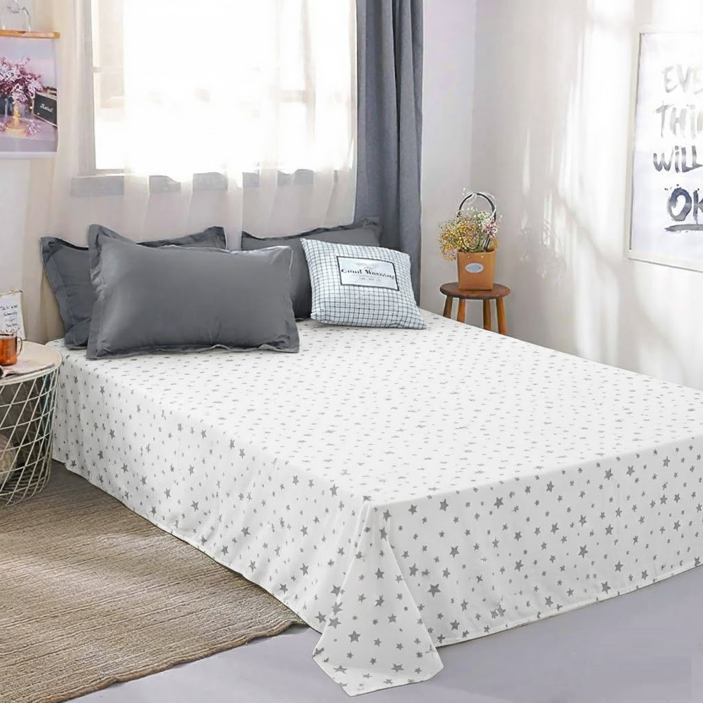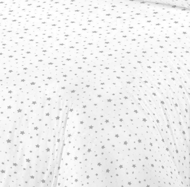 Простынь поплин Zastelli 235 разные звезды на белом. Простынь изготовлена из высококачественного поплина, сочетающего прочность, мягкость и комфорт. Ткань приятна на ощупь, хорошо пропускает воздух и обеспечивает комфортный сон в любое время года. Дизайн с серыми звёздами разного размера на светлом фоне создаёт стильный и современный вид. Нейтральная цветовая гамма гармонично сочетается с любым интерьером и элементами постельного белья. Простынь не линяет, не садится и сохраняет форму даже после множества стирок. Поплин легко гладится, быстро сохнет и не требует сложного ухода. Идеальный выбор для повседневного использования, сочетающий практичность и изящество. Такая простынь подарит вашей спальне уют и гармонию.