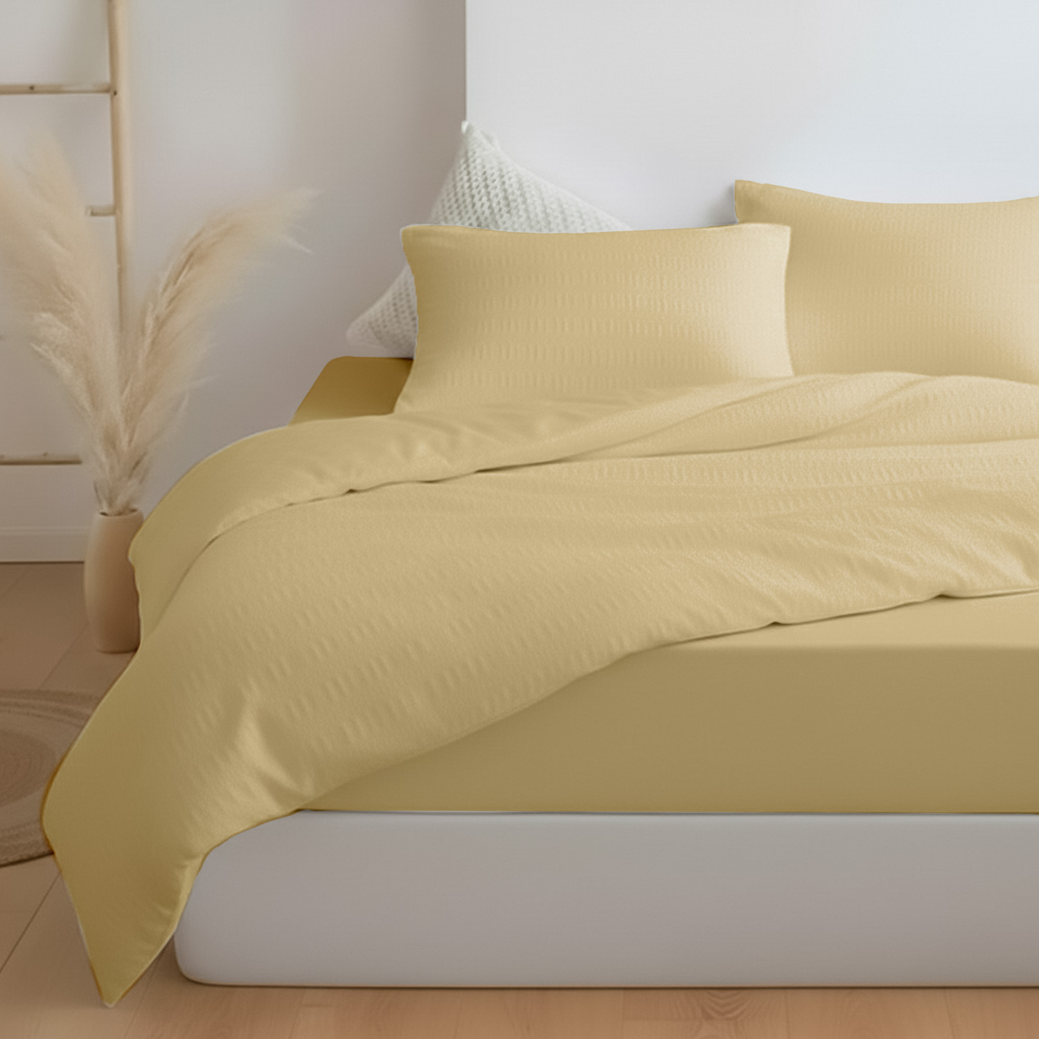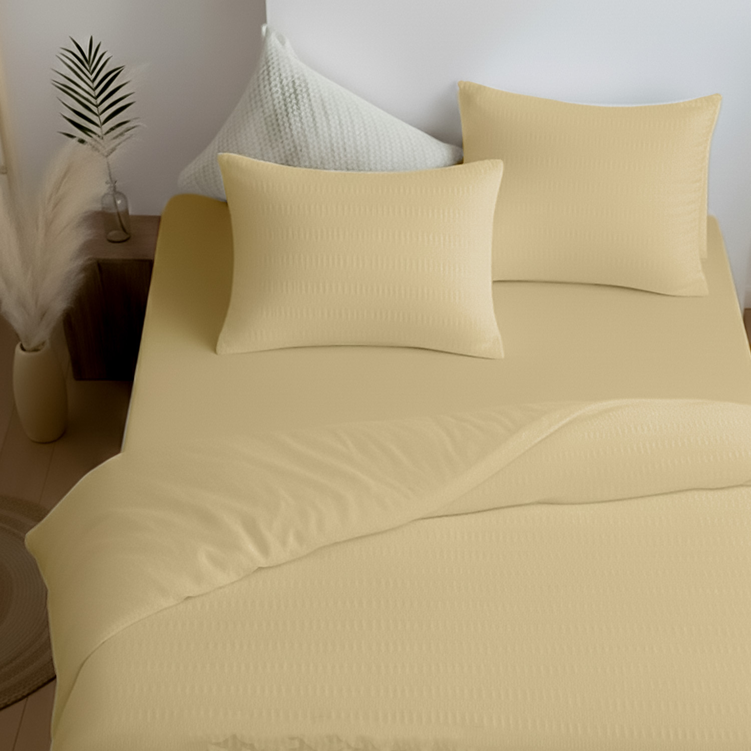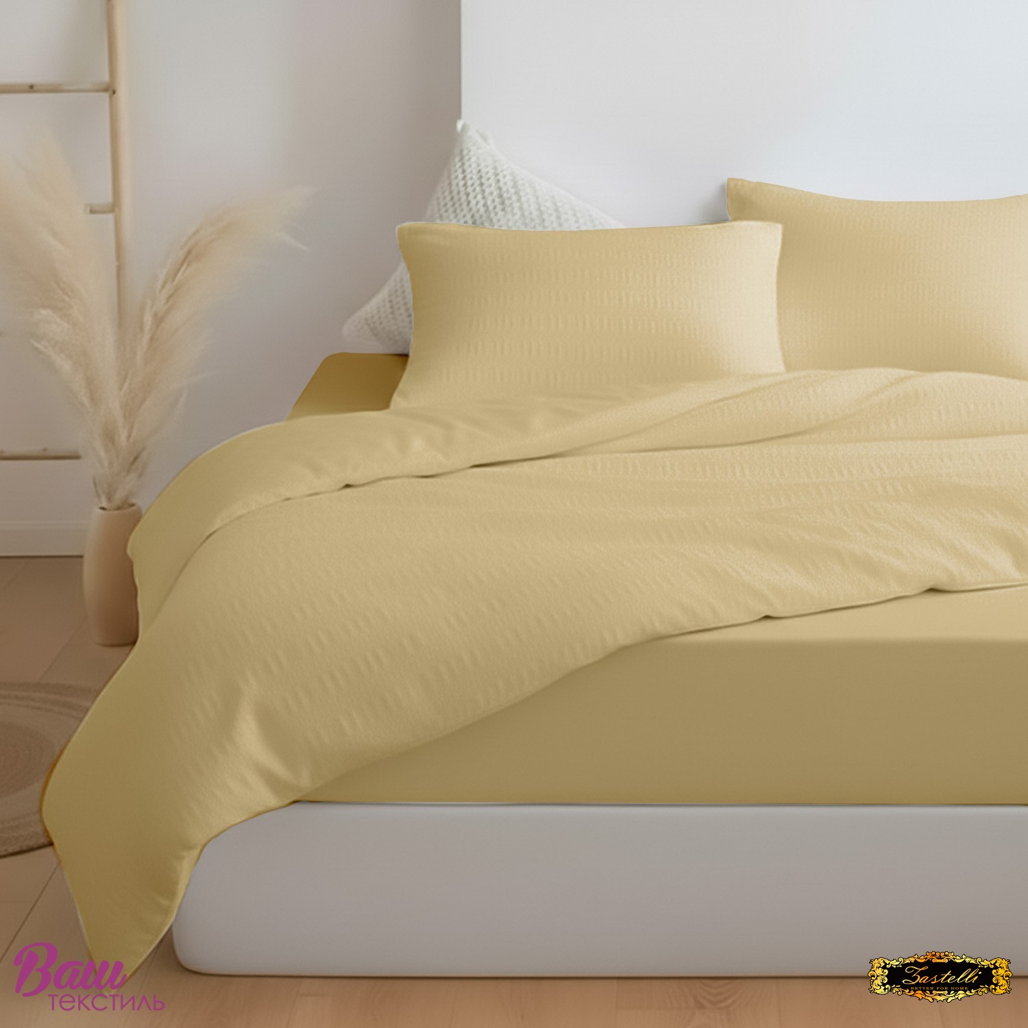 Постельное белье Zastelli 12-0712 Vanilla/Vanilla жатка хлопковая. Комплект постельного белья из жатого поликоттона — это сочетание элегантной простоты и практичного комфорта. Пододеяльник и наволочки выполнены из полностью жатой ткани поликоттон 50/50, которая не требует глажки и сохраняет аккуратный вид каждый день. Лёгкая фактура жатки придаёт комплекту стильный объём и современный характер. Простыня изготовлена из однотонной бязи, гладкой и приятной на ощупь, что создаёт идеальный баланс текстур. Тёплый оттенок Vanilla наполняет спальню мягким светом и ощущением уюта. Он выглядит нежно и гармонично, легко сочетается с различными стилями интерьера и добавляет пространству спокойствия и домашнего тепла. Поликоттон объединяет прочность и износостойкость с комфортом натуральной ткани. Комплект хорошо пропускает воздух и подходит для ежедневного использования в любое время года. Он станет отличным выбором как для дома, так и для отелей или апартаментов. Артикул 12-0712 Vanilla/Vanilla — универсальное решение для тех, кто ценит качество, практичность и сдержанную роскошь.