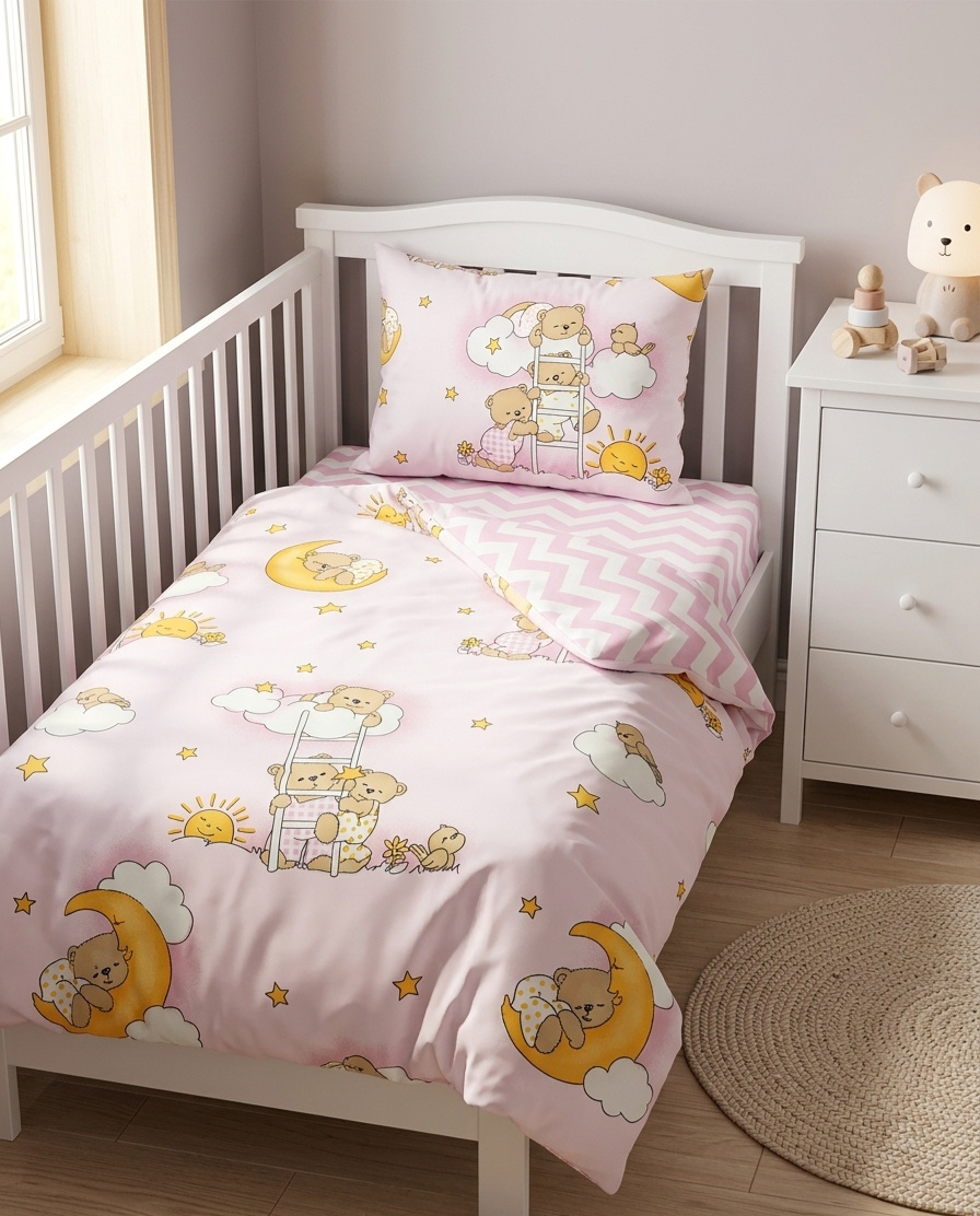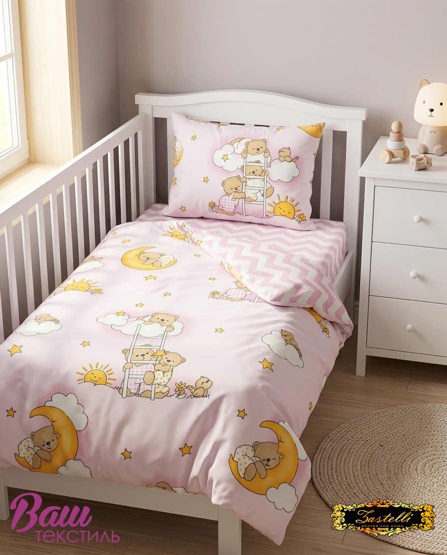 Постельное белье для новорожденных Zastelli 26 Мишки / 181 Зигзаг бязь. Этот очаровательный комплект из натуральной бязи создан, чтобы дарить вашему малышу самые сладкие сны. Ткань из 100% хлопка гипоаллергенна, мягка на ощупь и отлично пропускает воздух, обеспечивая комфортную температуру. Изюминкой набора является его дизайн: двусторонний пододеяльник с одной стороны украшен рисунками мишек на луне, а с другой — стильной розовой полоской-зигзагом. Наволочка повторяет сказочный сюжет с мишками, а простыня имеет лаконичный узор в зигзаг, идеально дополняющий ансамбль. Высокое качество печати гарантирует, что яркие рисунки останутся четкими даже после многократных стирок.