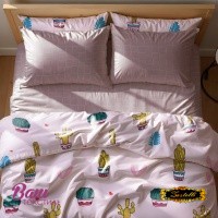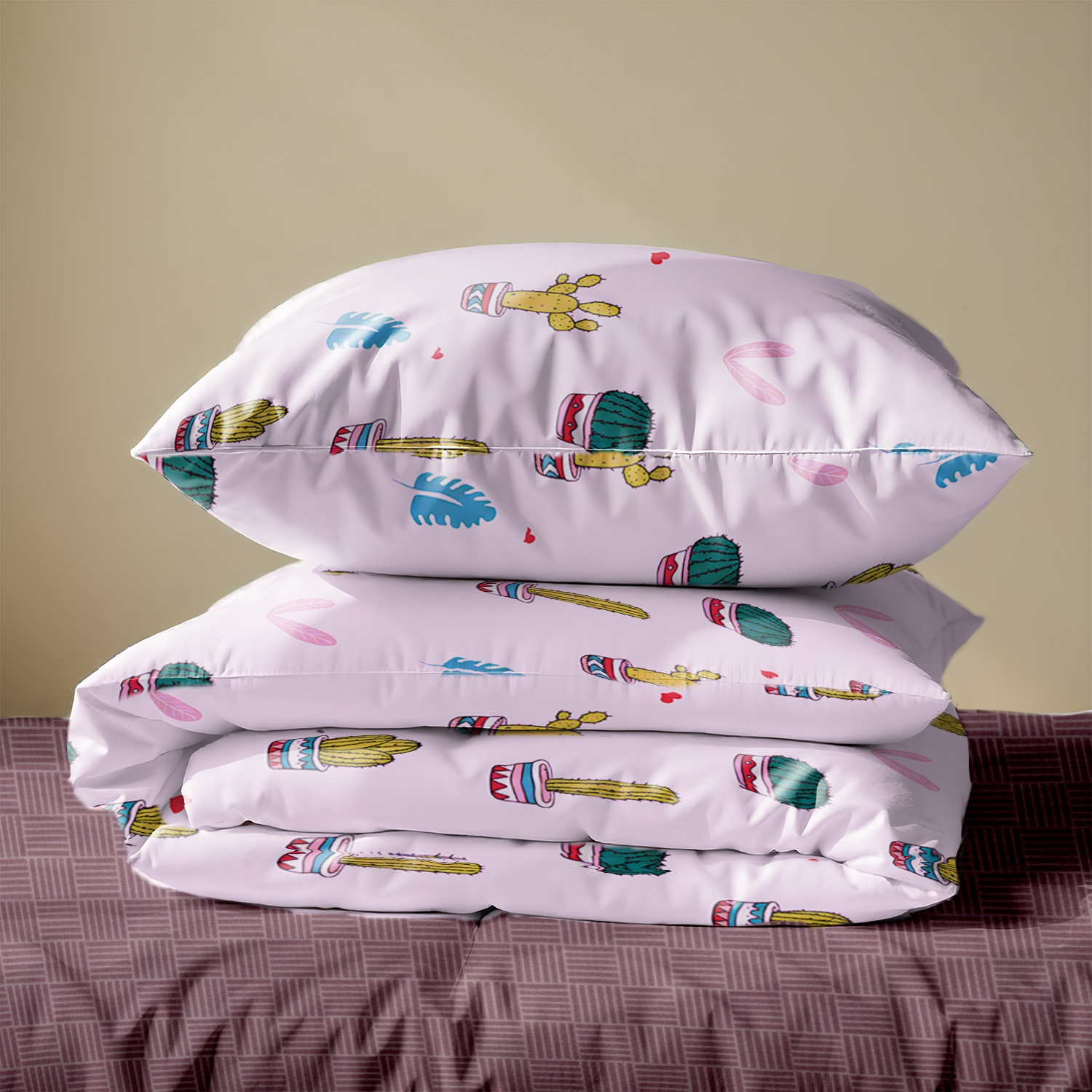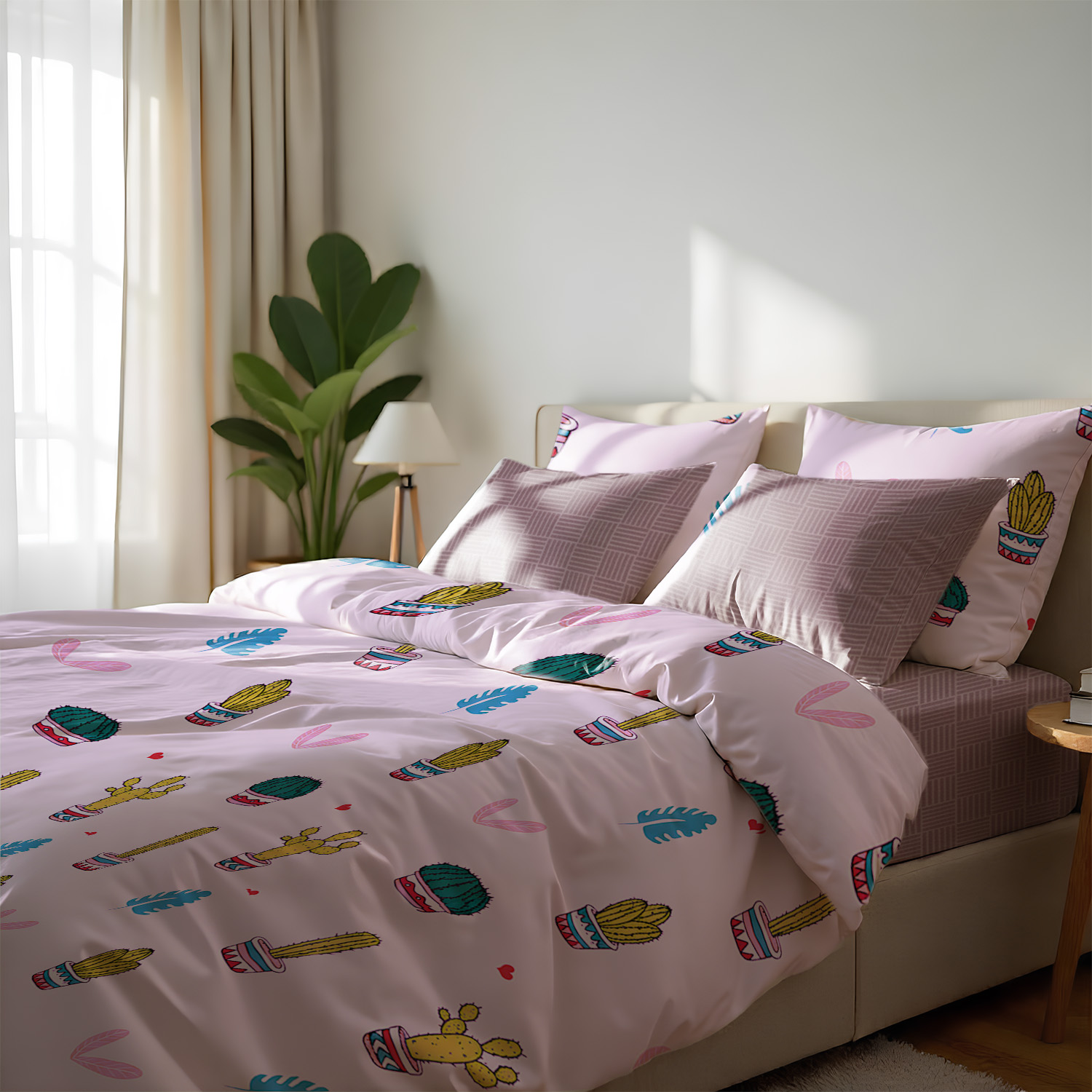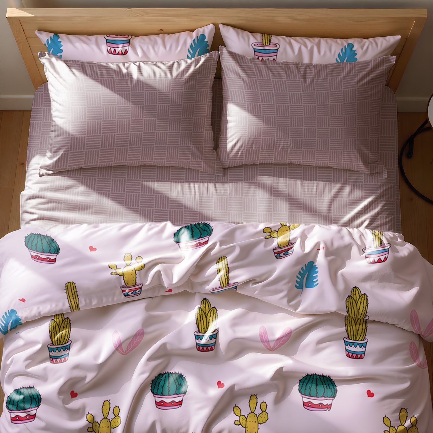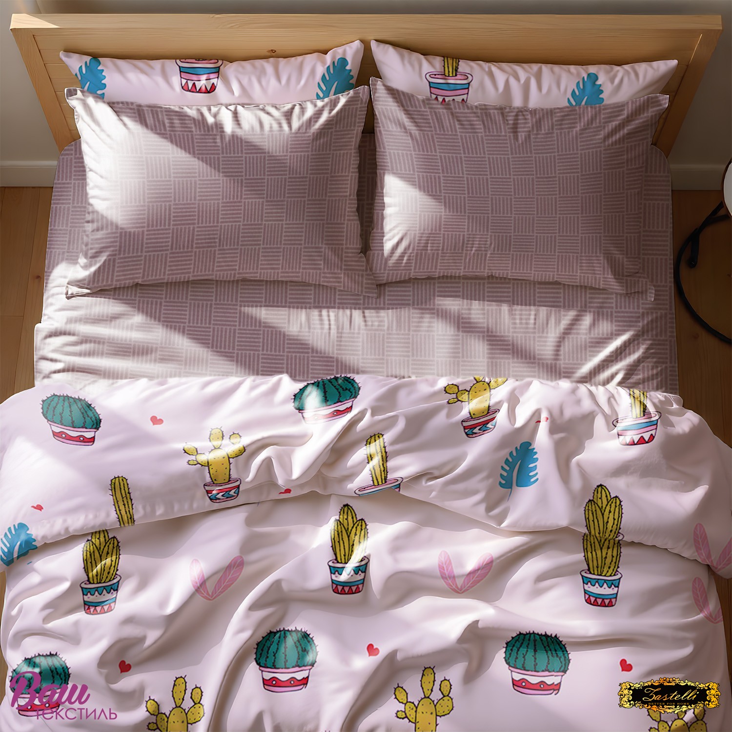 Bed linen set Zastelli 4339 cactus Calico. Enjoy freshness and a playful mood every day with this wonderful calico bedding set. This set instantly transforms your bedroom into an oasis of comfort thanks to its unique design featuring bright drawings of cacti and vibrant plant elements. The gentle color scheme, predominantly featuring light shades, creates a feeling of calm and lightness, making it ideal for a modern interior. Calico is a natural cotton fabric known for its exceptional durability, longevity, and ease of care, ensuring the set retains its original look even after numerous washes. Thanks to the material's high hygroscopicity and breathability, you will enjoy comfortable and healthy sleep throughout the night, regardless of the season. The sheet and the reverse side of the duvet cover feature a stylish, restrained geometric pattern that elegantly complements the dynamic main design of the set. This bedding set makes a great gift or a cheerful accent in your own bedroom, adding individuality and positivity. Choose this set to bring a touch of tropical cheerfulness and unparalleled comfort to your rest.