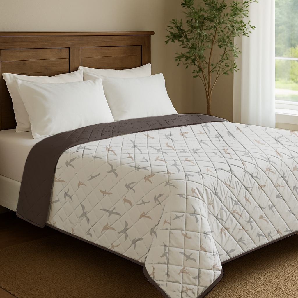 Double-sided bedspread BIRDS Reverce Brown/brown Zastelli. The bedspread is made of cotton calico on the front side and microfiber fabric on the back. The product is completely soldered with a square pattern, which not only decorates it, but also makes it durable and strong. Decorated with brown calico piping around the perimeter. The bedspread is very stylish, discreet, will decorate any interior. The product is easy to care for. Color and design - white with birds in flight on the front side, and plain brown on the back. Due to the soldering of the bedspreads, the filler is evenly distributed around the perimeter of the product, does not bunch up in the corners. An error of +-5 cm in size is allowed.