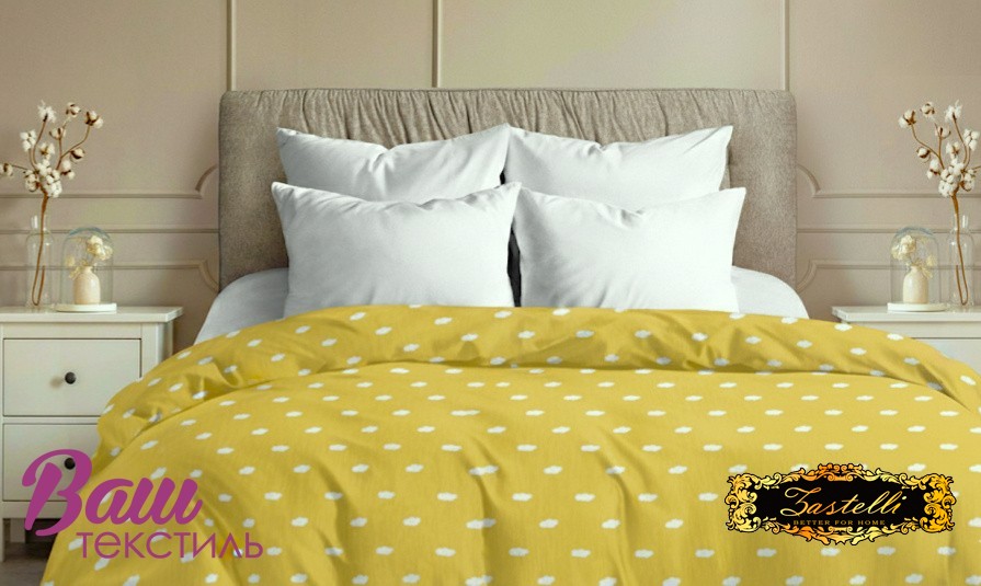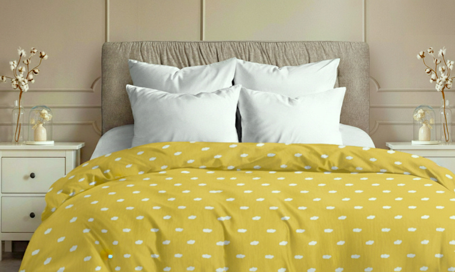 Duvet cover calico Zastelli Clours on yellow. This cotton duvet cover with a delicate cloud print on a yellow background creates a cozy and warm atmosphere in your bedroom. The natural cotton fabric feels soft to the touch and ensures comfortable sleep all year round. The cheerful yellow color lifts your mood and brings freshness to the room. The fabric is durable and easy to maintain — it washes well and retains its appearance after many washes. It is breathable, hypoallergenic, and perfect for daily use. An excellent choice for those who value comfort, practicality, and style.