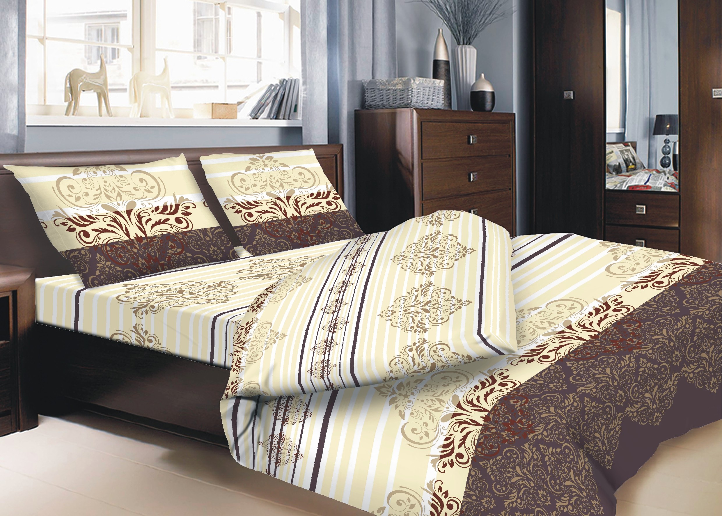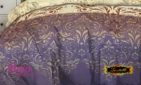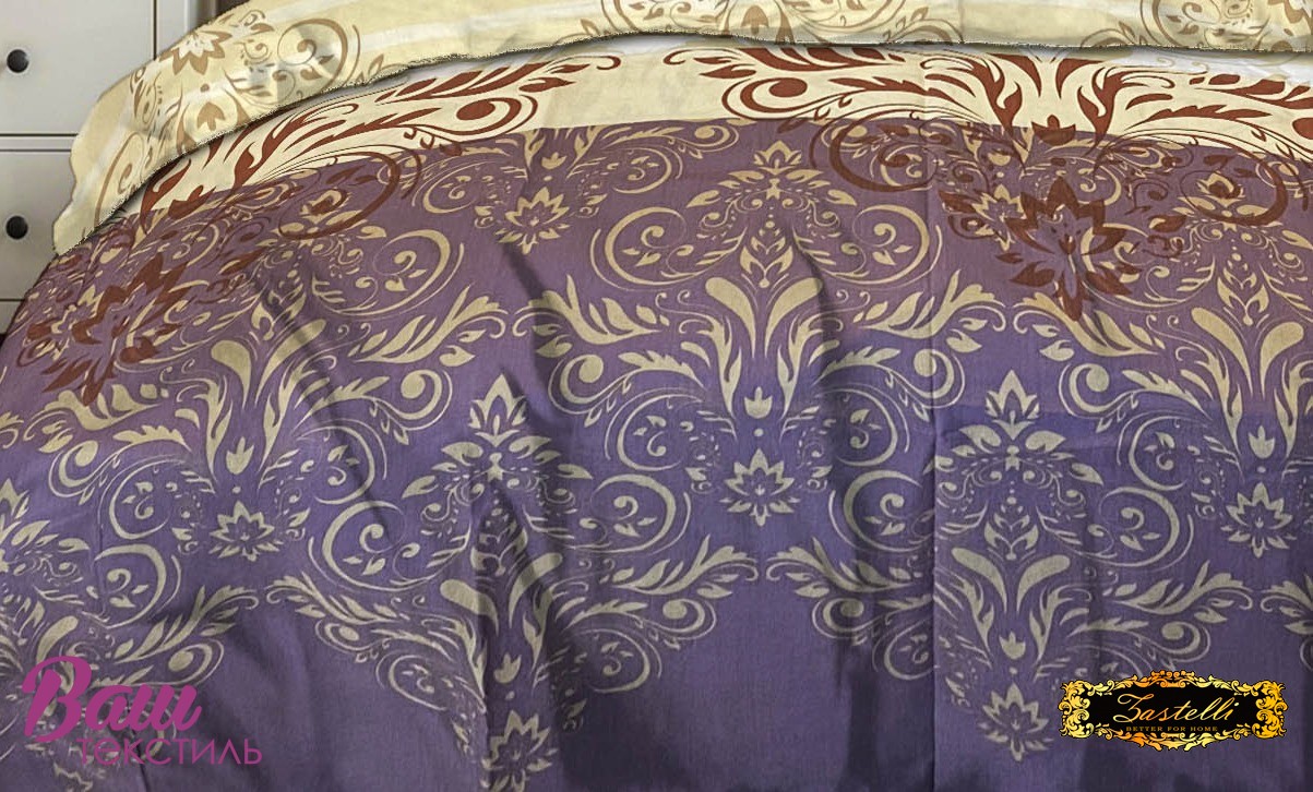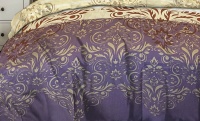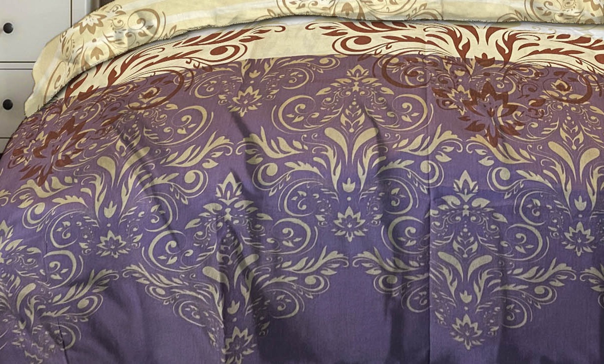 Calico sheet 25301. The bedsheet with ornamental swirls on purple and beige backgrounds adds a touch of elegance and sophistication to your bedroom. The graceful pattern creates a luxurious yet calm atmosphere. The combination of deep purple and soft beige tones looks harmonious and refined. Made from natural cotton, it ensures a soft, breathable, and comfortable sleeping experience. The dense cotton fabric retains its color and shape even after multiple washes. This bedsheet fits perfectly into both classic and modern interiors. It pairs beautifully with solid bedding in pastel or deep shades. Choose a bedsheet that blends elegance, comfort, and premium quality.