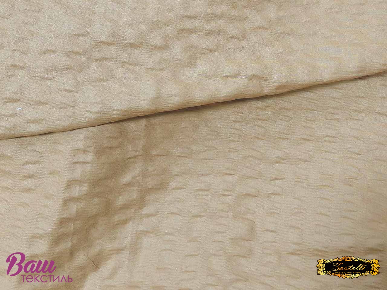 The fabric is produced from cotton and polyester fibers that undergo thermal or mechanical treatment to create long-lasting crinkles.