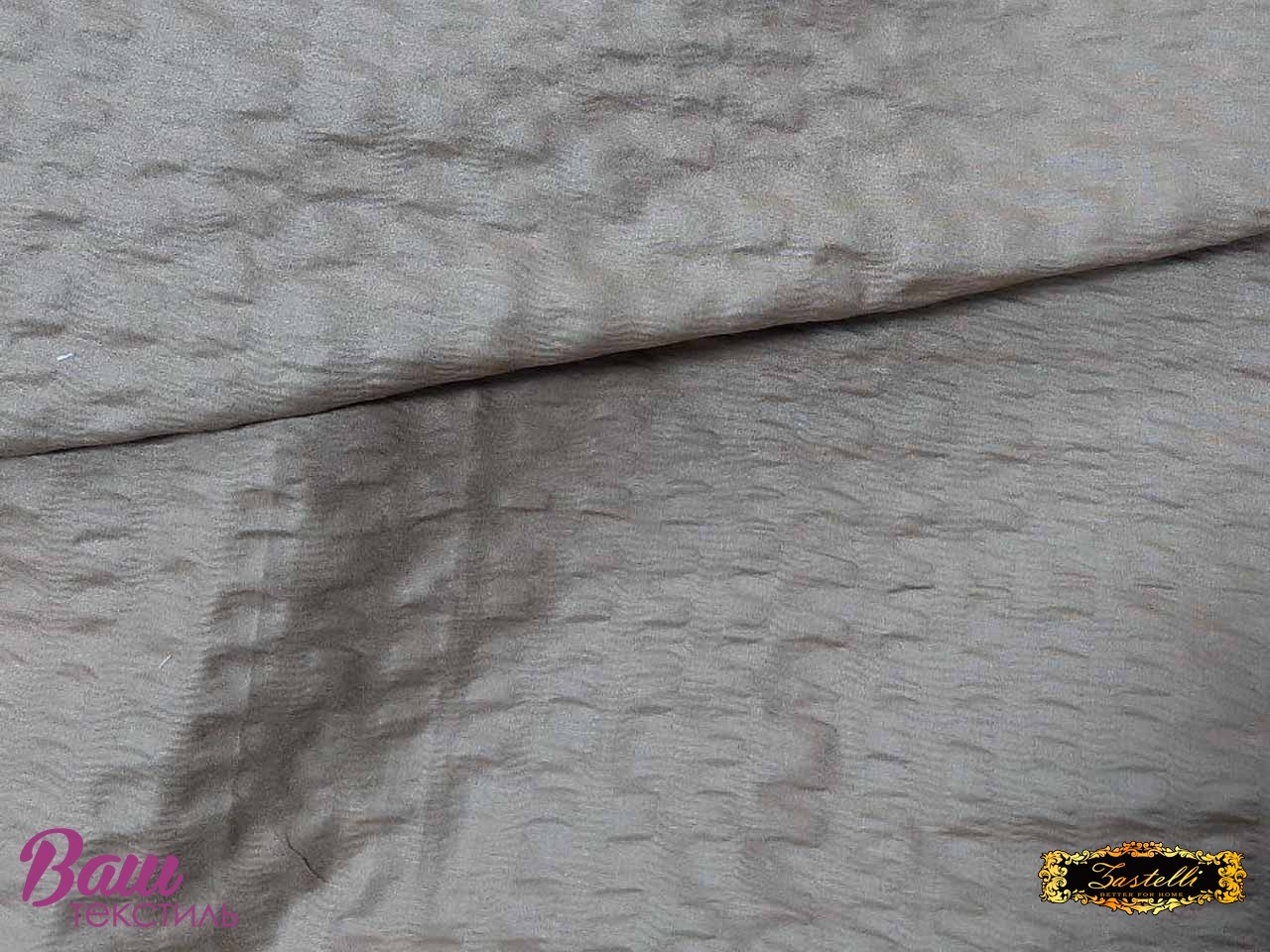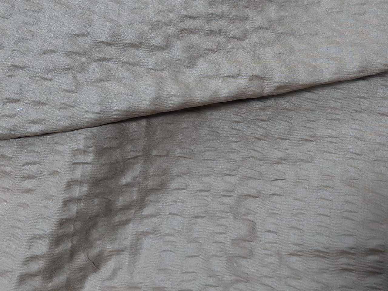 The fabric is produced from cotton and polyester fibers that undergo thermal or mechanical treatment to create long-lasting crinkles.