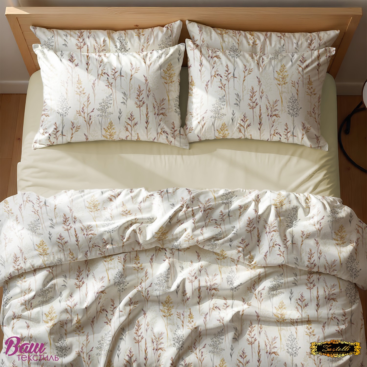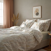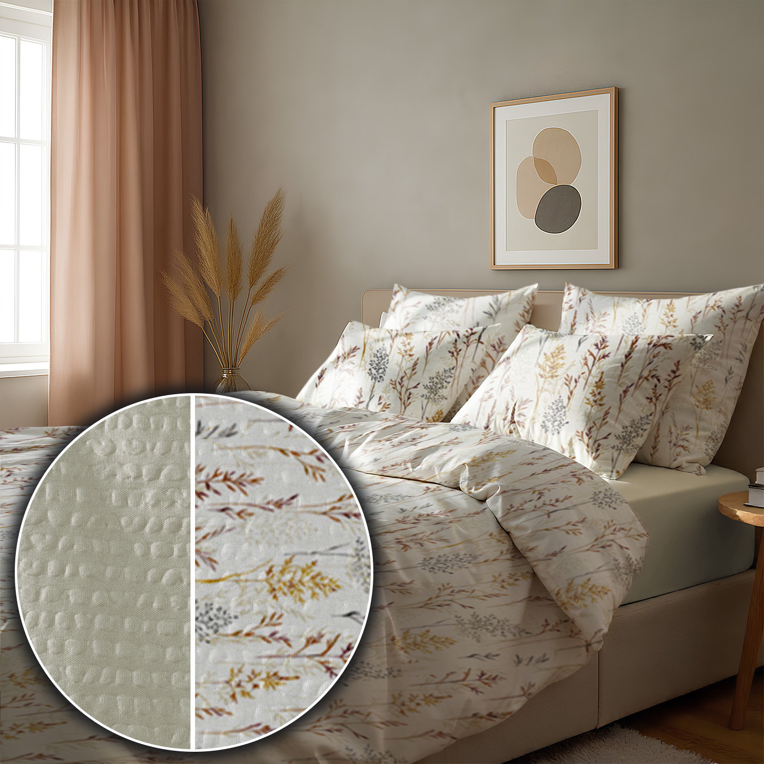 Постільна білизна Zastelli Y10498-10/Moonlight жатка виконана з рослинним принтом на кремовому фоні та доповнена однотонним бежевим простирадлом, що створює теплий і затишний вигляд. Ніжний природний малюнок додає комплекту легкості та елегантності. У набір входять простирадло, підковдра та наволочки, виготовлені з м’якої й комфортної жатої тканини. Комплект підходить для тих, хто цінує простоту та стриманий стиль. Тканина міцна та зносостійка, чудово зберігає форму після численних прань. Матеріал легко переться й не втрачає первісного вигляду. Важлива перевага жатки — її не потрібно прасувати. Це робить комплект надзвичайно зручним у щоденному використанні.
