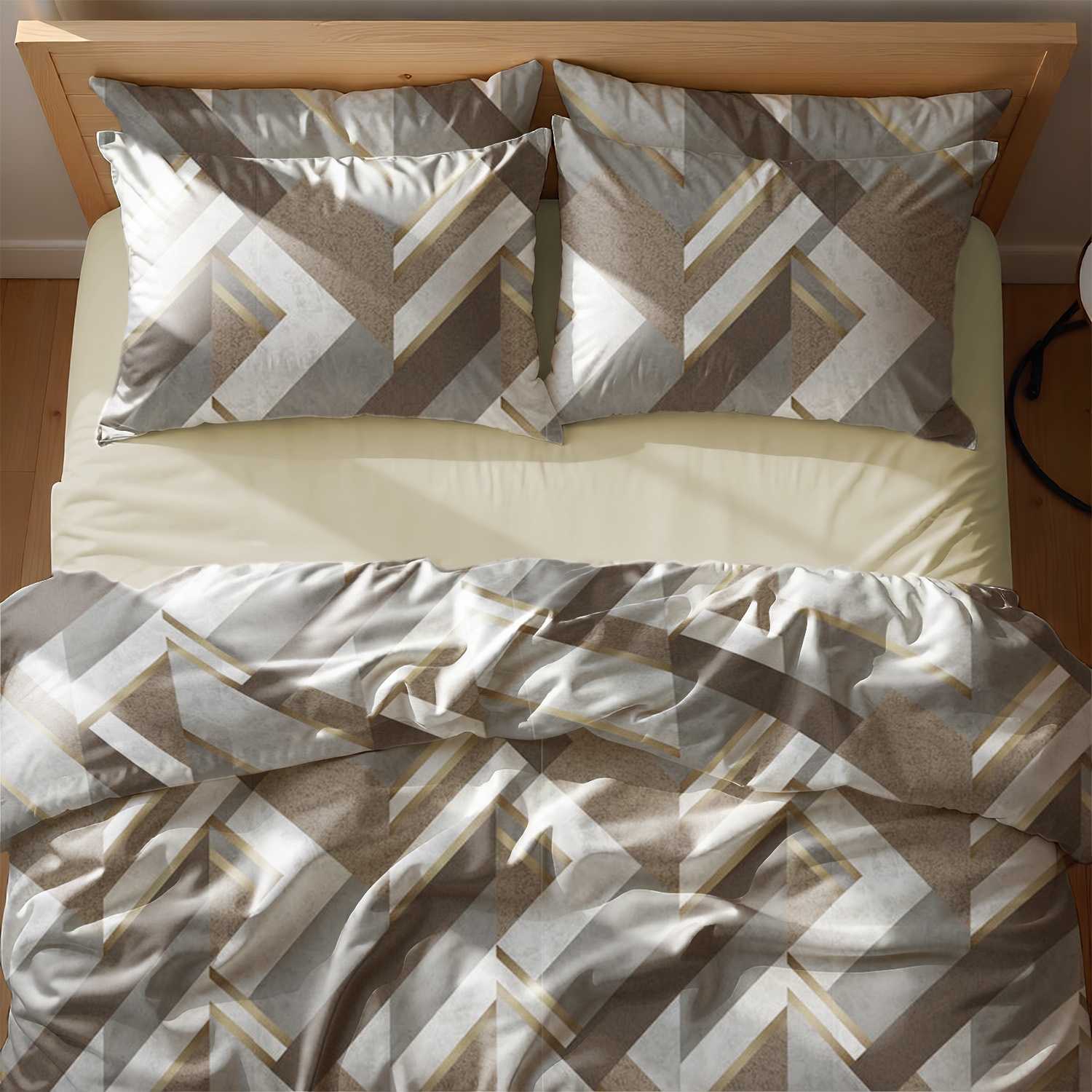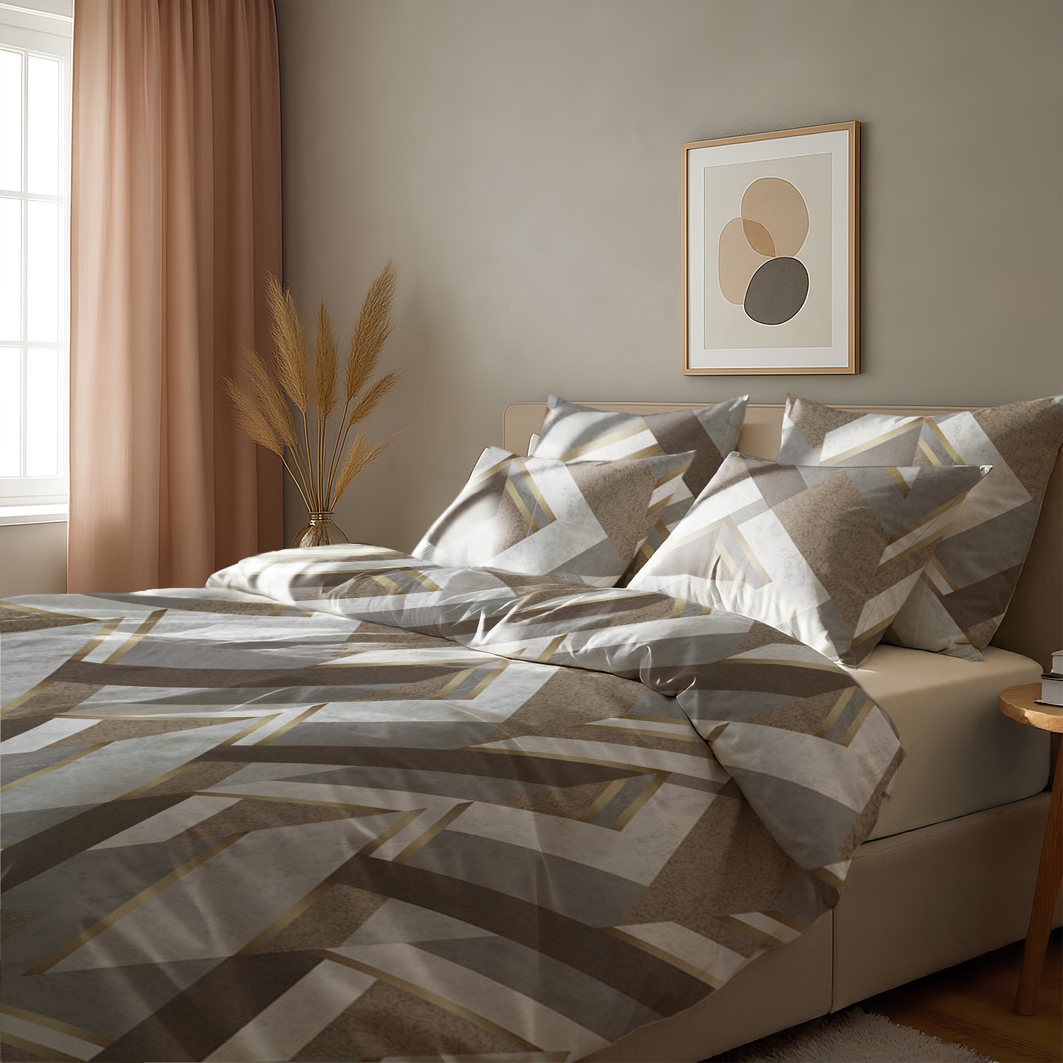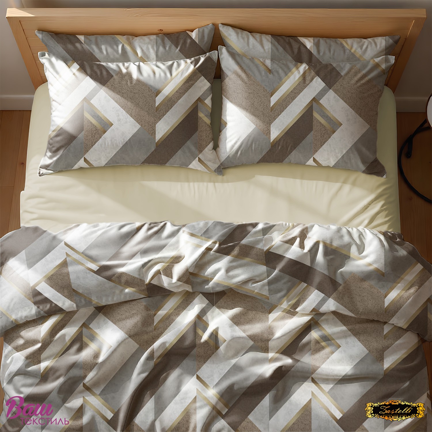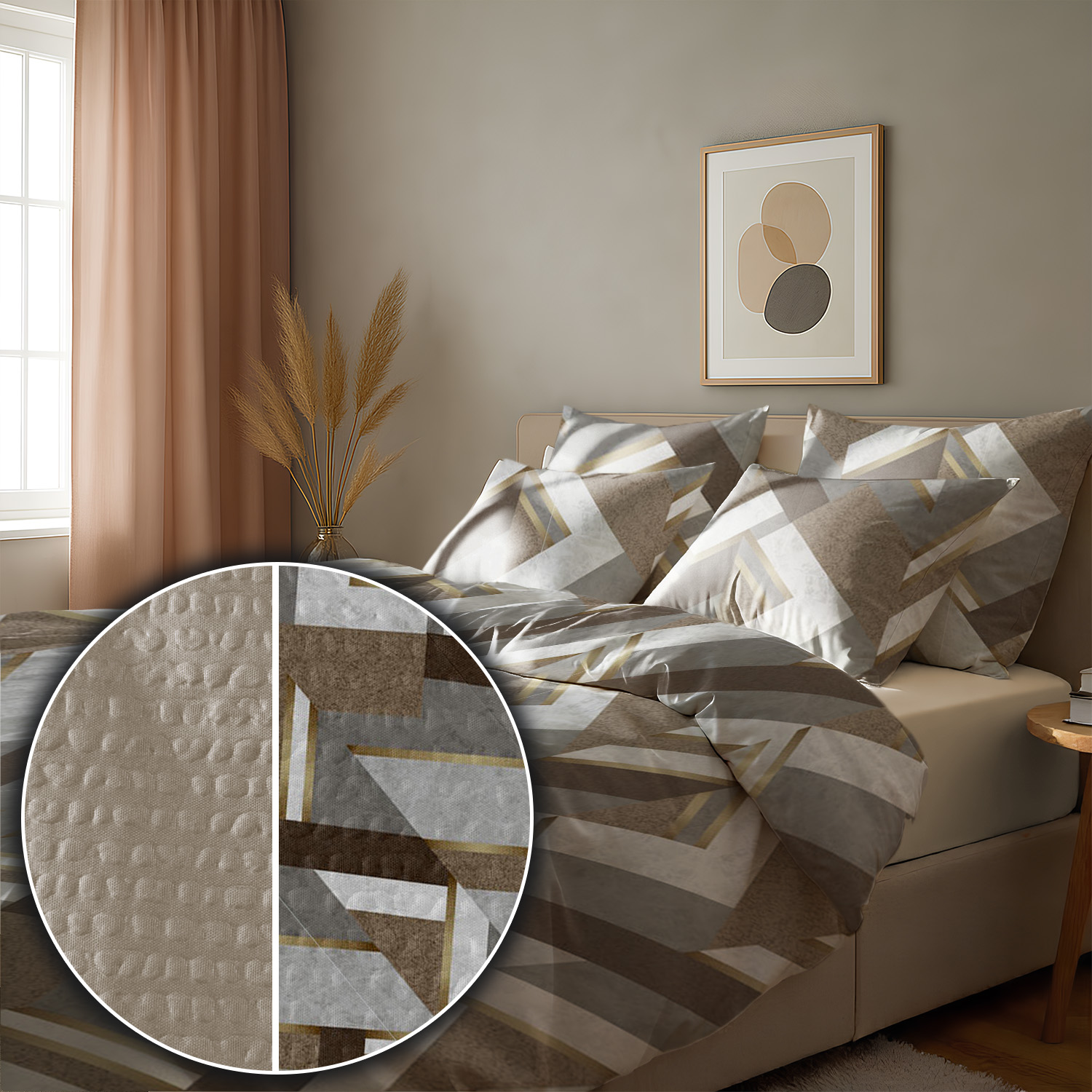 Постільна білизна Zastelli JH10229-9/Moonlight жатка виконана з абстрактним геометричним малюнком у бежевих, сірих і світлих тонах, що створює стильний та сучасний вигляд. Простирадло однотонне бежеве. Гармонійне поєднання кольорів надає комплекту стриманості та універсальності, легко вписуючись у будь-який інтер’єр. У набір входять простирадло, підковдра та наволочки, виготовлені з м’якого й комфортного жатого матеріалу. Комплект підходить для тих, хто цінує простоту та елегантність. Тканина міцна й зносостійка, добре переносить численні прання. Матеріал легко переться та зберігає первісний вигляд. Важлива перевага жатки — її не потрібно прасувати, що робить комплект дуже зручним у повсякденному користуванні.