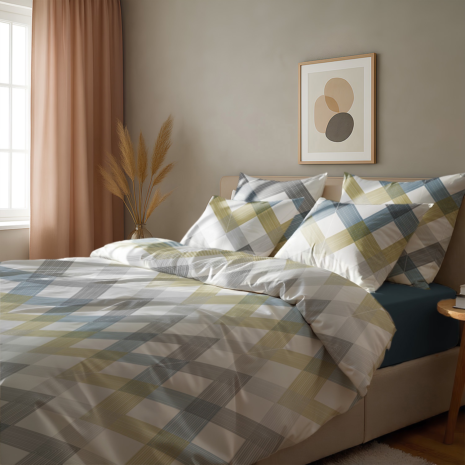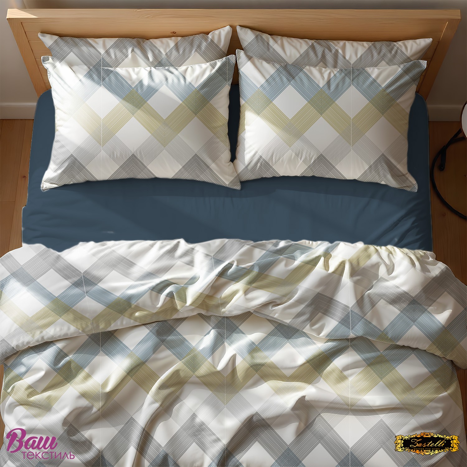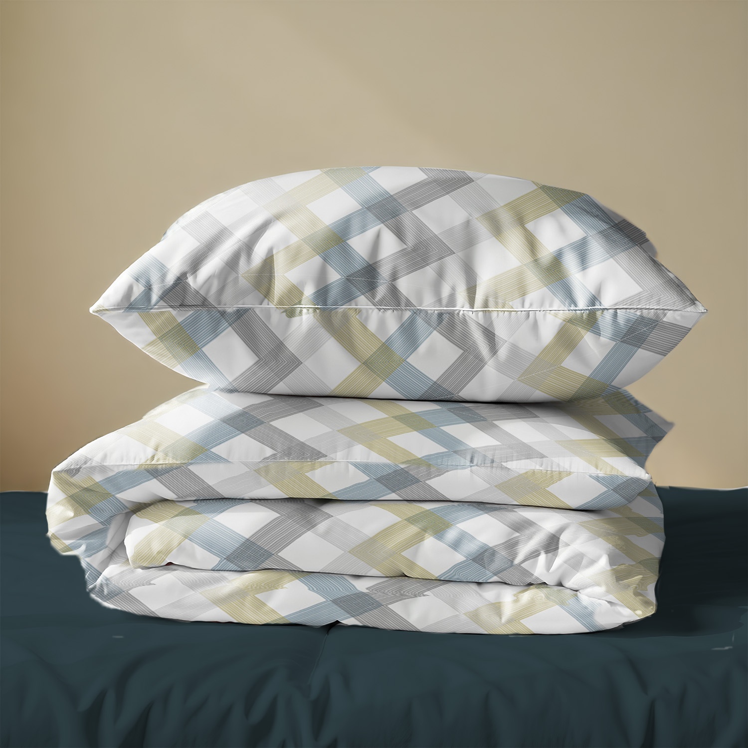 Постільна білизна Zastelli Y10269-4/Midnight Жатка виконана з абстрактним малюнком у блакитних, бежевих і сірих смугах на білому фоні та доповнена однотонним синім простирадлом, що створює сучасний і свіжий вигляд. Поєднання світлої основи й контрастних акцентів робить дизайн універсальним та стильним. У набір входять простирадло, підковдра та наволочки, виготовлені з м’якого й комфортного жатого матеріалу. Комплект підходить для тих, хто цінує простоту та елегантність. Тканина міцна й зносостійка, добре переносить численні прання. Матеріал легко переться та зберігає первісний вигляд. Важлива перевага жатки — її не потрібно прасувати, що робить комплект дуже зручним у повсякденному користуванні.